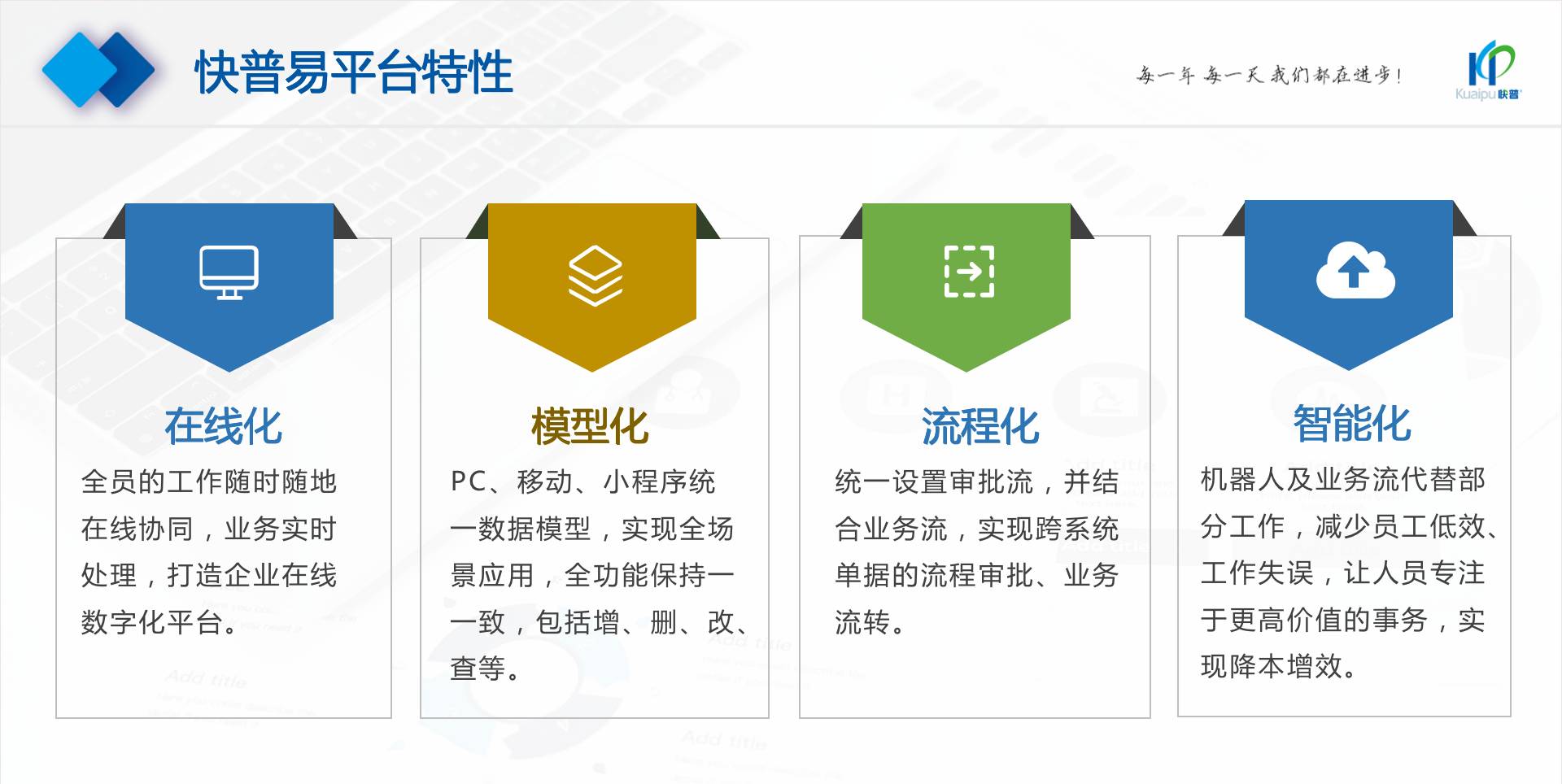為了解決市場(chǎng)需求與平臺(tái)產(chǎn)品瓶頸等矛盾,實(shí)現(xiàn)徹底的零代碼平臺(tái),快普?qǐng)?jiān)持理念創(chuàng)新,以理念推動(dòng)平臺(tái)技術(shù)的創(chuàng)新。“以不變應(yīng)萬(wàn)變”的理念:分析哪些東西未來(lái)肯定不變?哪些趨勢(shì)未來(lái)一定會(huì)變?從變化中找出不變的因素,從不變中找出變動(dòng)的因素;從量變到質(zhì)變,經(jīng)歷萬(wàn)變總結(jié)抽象出不變的本質(zhì)?;诳炱臻L(zhǎng)期的信息化服務(wù)經(jīng)驗(yàn),開(kāi)發(fā)配置出企業(yè)數(shù)字化轉(zhuǎn)型工具:快普易平臺(tái)成功解決了企業(yè)數(shù)字化轉(zhuǎn)型升級(jí)面臨的客戶大量個(gè)性化需求,真正實(shí)現(xiàn)隨需而變的設(shè)計(jì)理念,大大降低了信息化投入成本,提高信息化效率,幫助企業(yè)實(shí)現(xiàn)自主可控的技術(shù)創(chuàng)新,從而進(jìn)一步推動(dòng)企業(yè)的業(yè)務(wù)創(chuàng)新和管理創(chuàng)新。