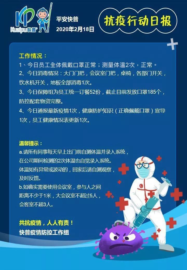 2月15日,公司正式成立“快普疫情防控工作組”,由各事業(yè)部報名推選的19位同事共同擔(dān)任。工作組從環(huán)境消毒、健康監(jiān)測、物資保障、防護(hù)知識宣導(dǎo)四方面全力抗疫,保障職場健康。