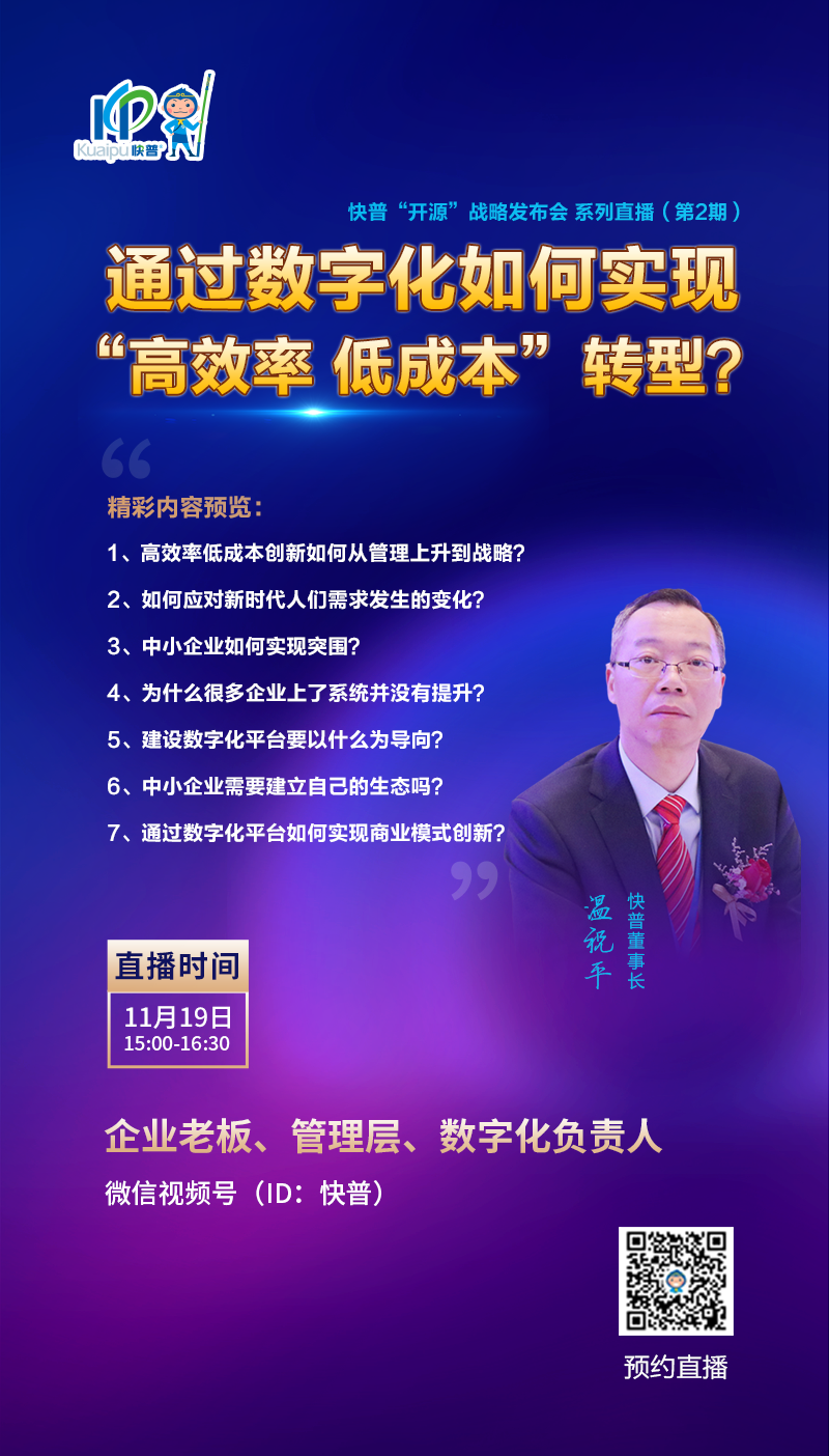 為幫助新老客戶共渡難關(guān),共同面對疫情反復(fù)、俄烏戰(zhàn)爭持久化及中美沖突加劇帶來的各種風(fēng)險和挑戰(zhàn),幫助中國企業(yè)低成本、高效率進(jìn)行數(shù)字化轉(zhuǎn)型, 快普已正式啟動ERP“開源”戰(zhàn)略!發(fā)布會(系列)直播從10月起通過“快普”視頻號陸續(xù)播出,與您分享近三年快普最新研發(fā)成果及數(shù)字化轉(zhuǎn)型解決方案,歡迎新老客戶預(yù)約收看,相信能為您的企業(yè)轉(zhuǎn)型帶來新的啟發(fā)。