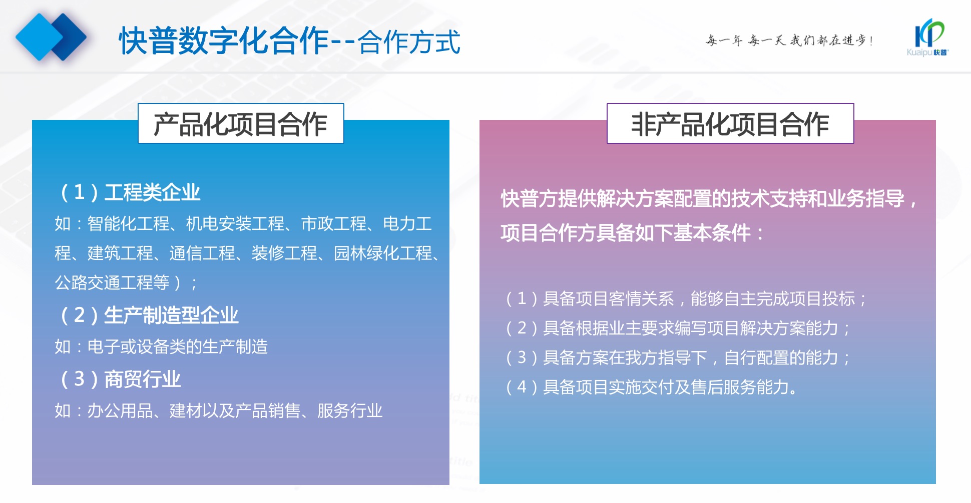 項目合作視合作方的貢獻度不同,再區(qū)分產(chǎn)品化和非產(chǎn)品化的項目合作,提供多種項目合作模式及分成比例。簽約產(chǎn)品代理具備ERP軟件業(yè)務擴展和實施交付能力,也可視承諾量OEM產(chǎn)品。