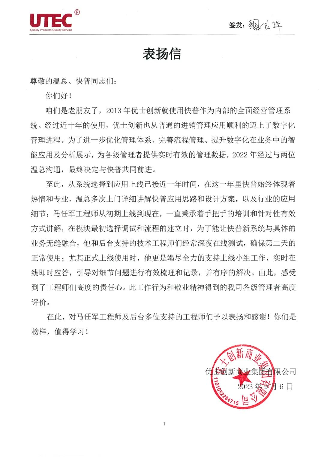 【簡訊】老客戶優(yōu)士創(chuàng)新商業(yè)集團有限公司(以下簡稱“優(yōu)士創(chuàng)新”)向我司發(fā)來感謝信,對快普的平臺、產(chǎn)品和團隊服務(wù)給予了高度肯定,并特別對實施工程師馬任軍的專業(yè)、敬業(yè)及高度責心提出了表揚和贊賞。
