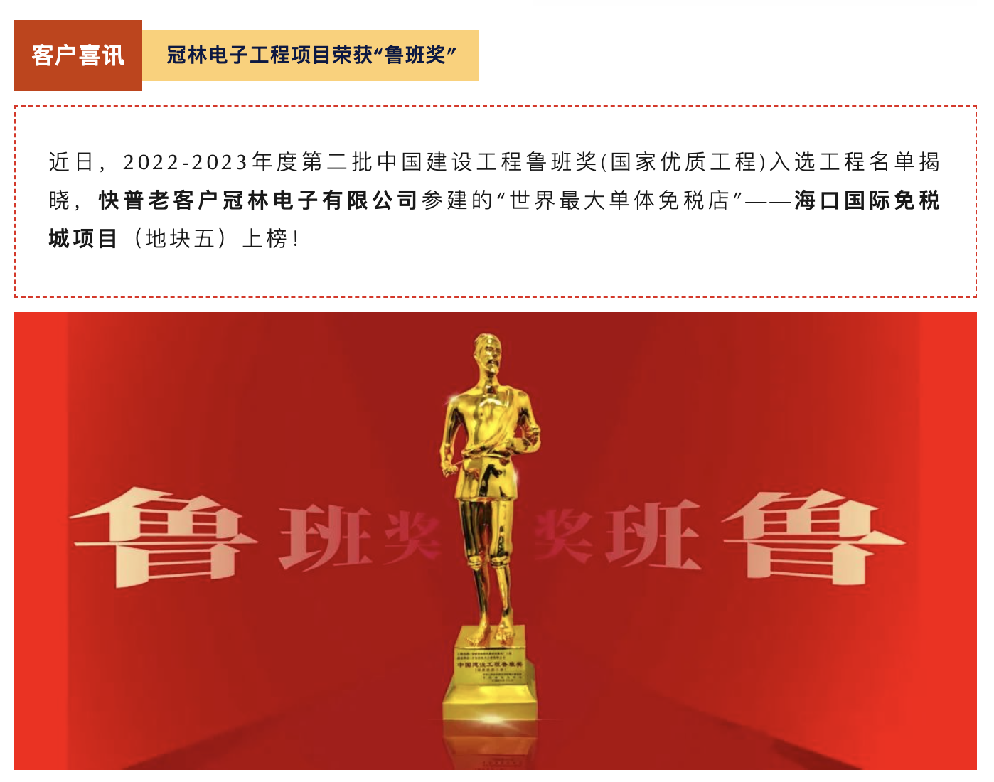 中國建設(shè)工程魯班獎(國家優(yōu)質(zhì)工程)是由中華人民共和國住房和城鄉(xiāng)建設(shè)部指導、中國建筑業(yè)協(xié)會實施評選的獎項,是中國建筑行業(yè)工程質(zhì)量最高榮譽獎,被譽為中國建筑業(yè)的“奧斯卡”,主要授予中國境內(nèi)已經(jīng)建成并投入使用的各類新(擴)建工程,且工程質(zhì)量應達到國內(nèi)領(lǐng)先水平。