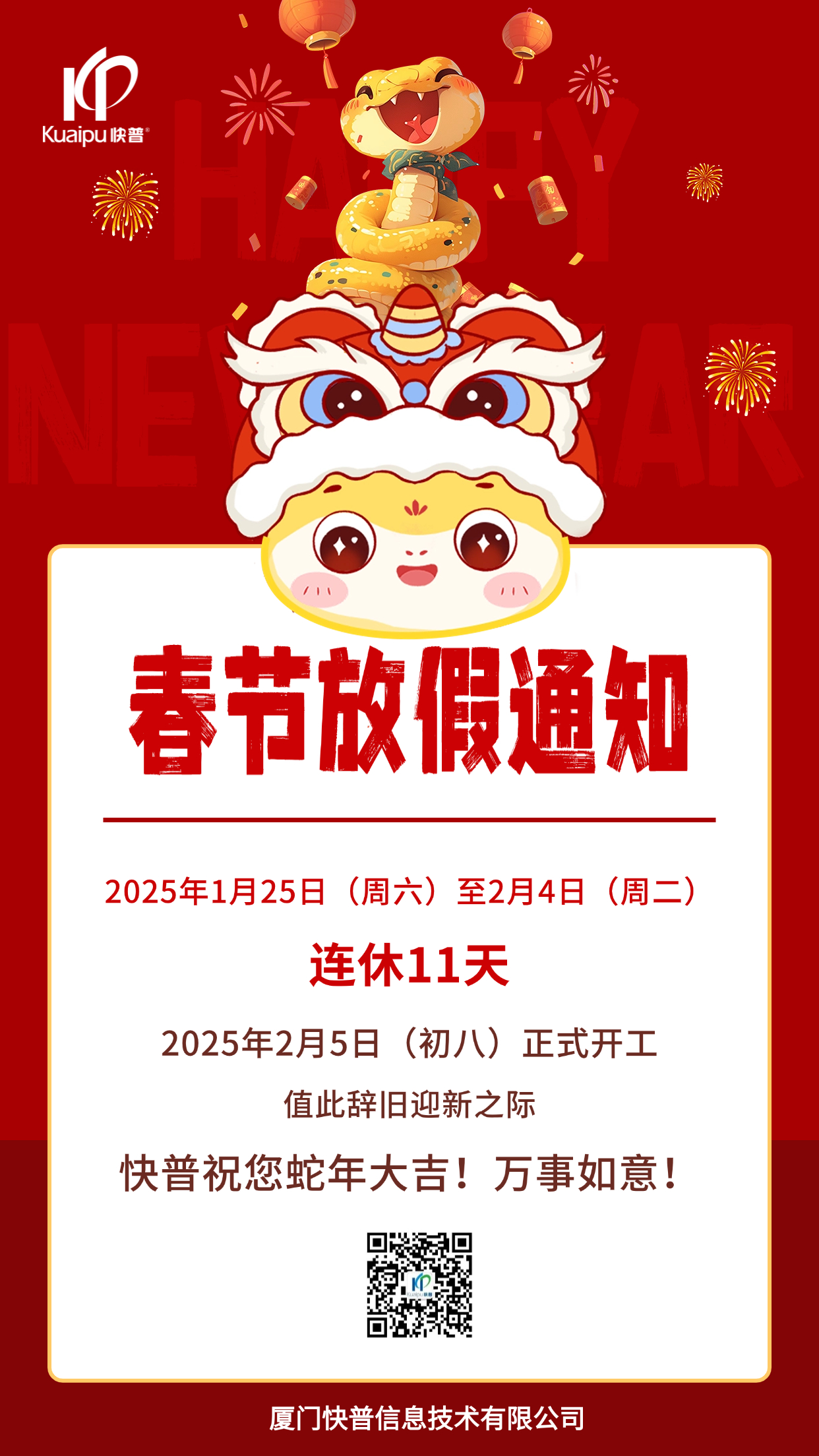 2025年春節(jié)即將到來,快普公司全體員工提前恭祝快普用戶在新的一年里,生活美美滿滿,事業(yè)紅紅火火,財源滾滾而來,家庭和和美美,幸福永遠常在。