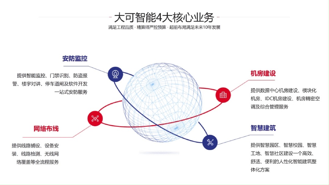 江蘇大可智能工程有限公司(以下簡(jiǎn)稱“江蘇大可”)成立于 2010 年,是一家領(lǐng)先的弱電智能化系統(tǒng)綜合方案提供商,專注智慧建筑整體解決方案設(shè)計(jì)與施工,以及大型企業(yè)弱電系統(tǒng)集成,包括安全防范系統(tǒng)、網(wǎng)絡(luò)綜合布線系統(tǒng)、核心機(jī)房工程、多媒體廣播系統(tǒng)、智能樓宇控制系統(tǒng)等,同時(shí)圍繞集成項(xiàng)目開展銷售和運(yùn)維服務(wù)。