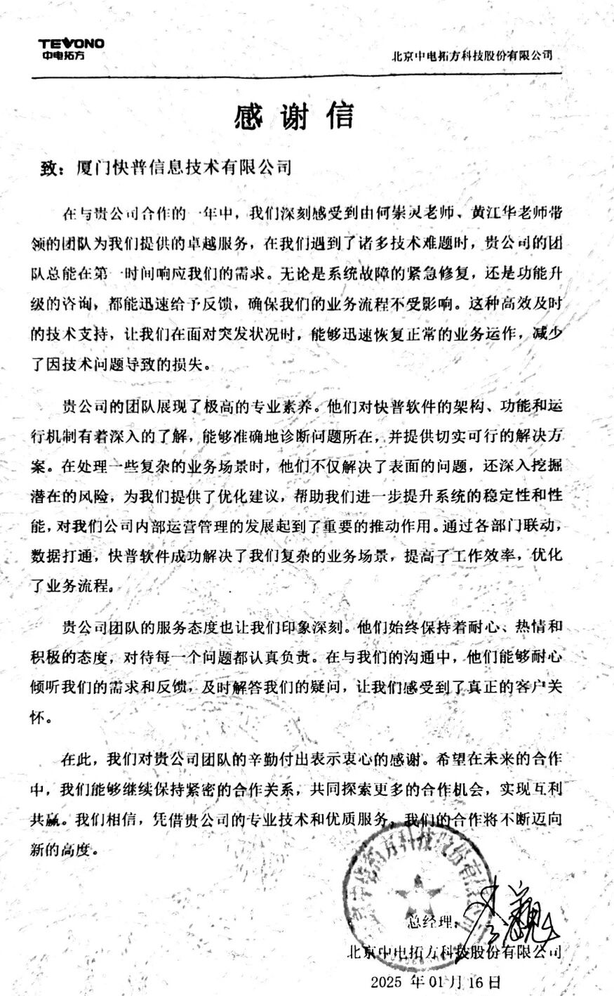 【快普簡(jiǎn)訊】 北京中電拓方科技股份有限公司向我司發(fā)來感謝信,對(duì)何崇靈老師、黃江華老師帶領(lǐng)的實(shí)施小組在過去一年中提供的優(yōu)質(zhì)服務(wù)表示高度認(rèn)可和衷心感謝。來信不僅是對(duì)快普實(shí)施團(tuán)隊(duì)專業(yè)能力的肯定,更是對(duì)快普“客戶至上”服務(wù)理念的詮釋。