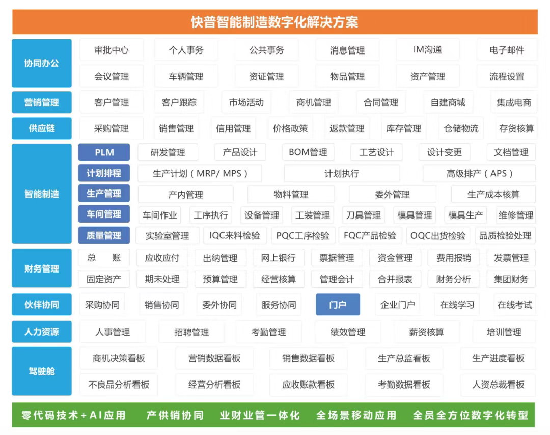 快普智能制造數(shù)字化解決方案整合了12大系統(tǒng),全面覆蓋華達環(huán)衛(wèi)的管理需求,為其提供協(xié)同辦公、客戶關系、供應鏈、財務會計、智能制造(含研發(fā)PLM、MRP、APS、生產、車間、質量等管理)、售后管理、伙伴平臺、租賃管理、人力資源等一站式管理。