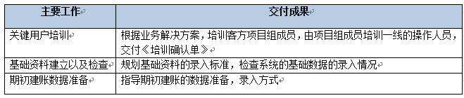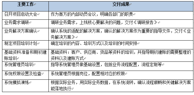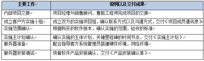 該階段主要是做實施基礎(chǔ)的搭建,包括完成內(nèi)部交接、確認(rèn)雙方的項目組成員名單、確認(rèn)實施范圍、確認(rèn)實施計劃、服務(wù)器準(zhǔn)備以及軟件部署。該階段結(jié)束以《項目啟動階段里程碑確認(rèn)單》作為交付。