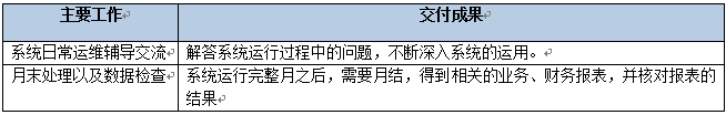該階段主要是做系統(tǒng)開賬運作之后,持續(xù)支持運用中出現(xiàn)的所有問題,系統(tǒng)運行完整月之后,指導(dǎo)月結(jié),得到相關(guān)的報表數(shù)據(jù)。該階段結(jié)束以《持續(xù)支持里程碑確認(rèn)單》作為交付。