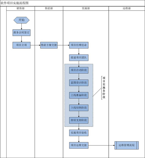 快普軟件項目實施分為五個階段:項目啟動階段、藍圖設(shè)計階段、上線準(zhǔn)備階段、上線切換階段、持續(xù)支持階段。每個階段都有對應(yīng)的階段交付成果。完成這五個階段的任務(wù)之后,進入實施項目驗收階段。實施驗收完成之后,轉(zhuǎn)入運維部門,實施過程結(jié)束。